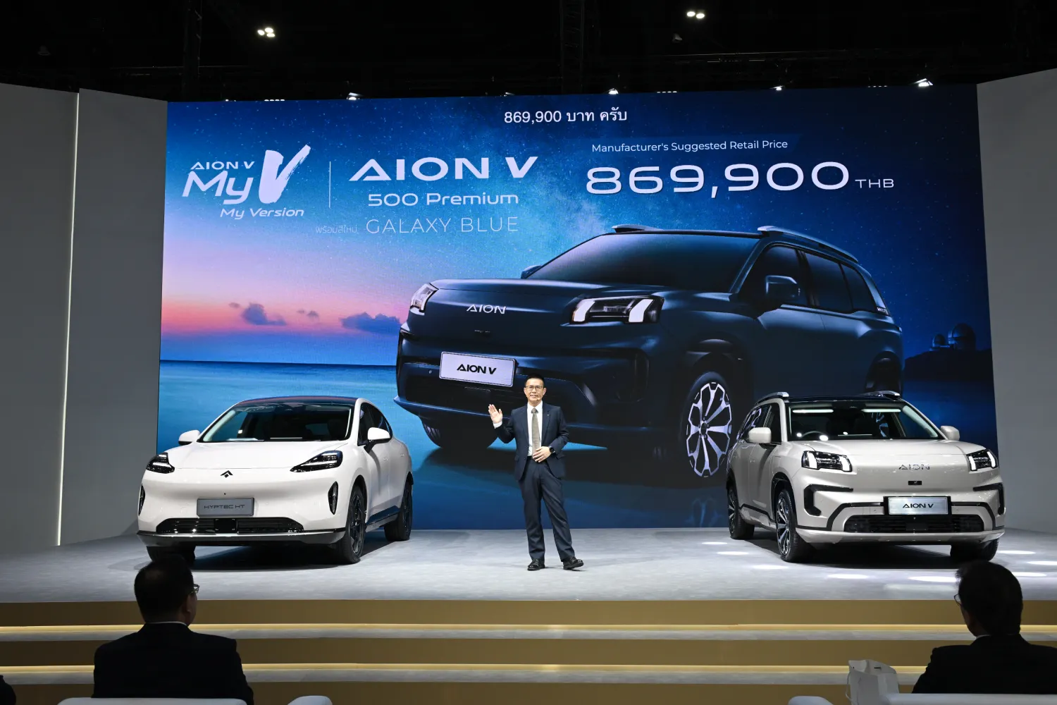 GAC AION V 500 Premium เป็นรถ AION V รุ่นย่อยใหม่ เปิดตัวด้วยสีใหม่ล่าสุด “Galaxy Blue” (สีพิเศษเฉพาะรุ่น 500 Premium เท่านั้น) ชูจุดเด่นเรื่องความคุ้มค่า ด้วยระยะทางขับขี่สูงสุด 500 กม. (NEDC) พร้อมเทคโนโลยีชาร์จเร็ว 3C กำลังสูงสุด 150 kW (30-80% ใน 16 นาที) ตัวรถและห้องโดยสารขนาดใหญ่ และฟังก์ชันที่ครบครัน